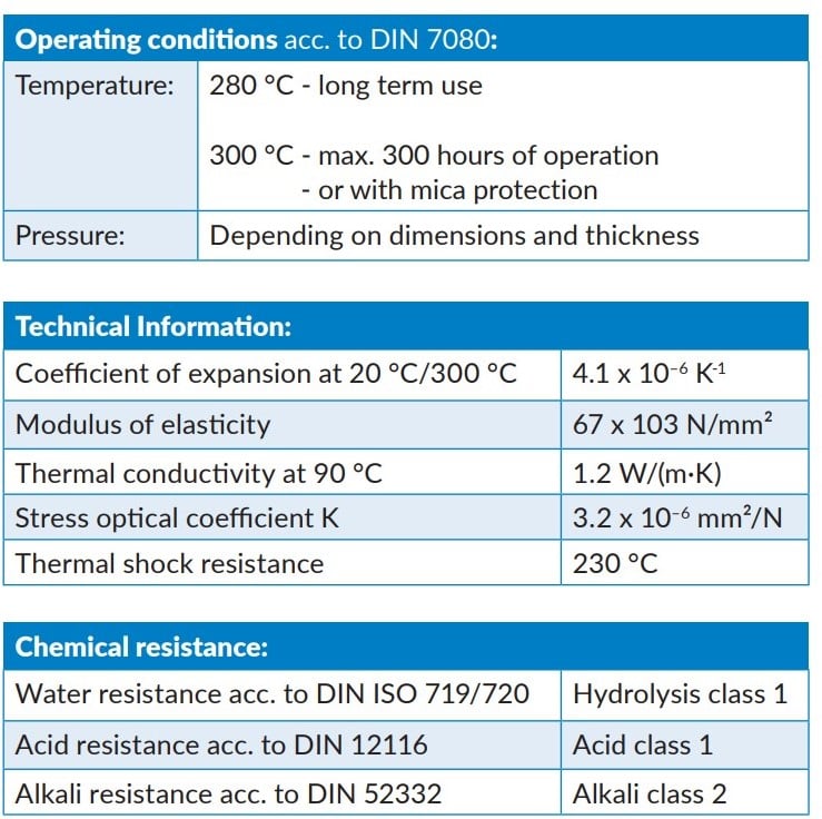 MAXOS® Borosilicaat Veiligheidskijkglazen volgens DIN 7080 zijn essentieel waar onder druk, bij thermische en chemische belasting, de visuele inspectie van processen in tanks moet worden gewaarborgd. De hoge veiligheid van de ronde DIN 7080 kijkglazen wordt bereikt door speciaal borosilicaatglas met goede chemische bestendigheid, buitengewone zuiverheid en homogeniteit. In combinatie met de lage thermische uitzetting die typisch is voor dit borosilicaatglas, leidt thermische voorbelasting (harding) tot een bijzonder hoge weerstand tegen temperatuurwisselingen.