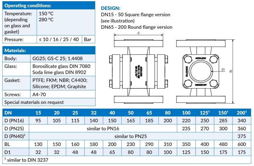 550-K Inline kijkglas met flenzen en stromingsklep PN16 PN25 en PN40