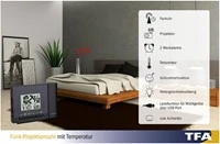 - De radiografisch bestuurbare wekker van TFA projecteert de huidige tijd in heldere, rode cijfers op de muur of het plafond van uw slaapkamer. Dankzij de draaibare projector past u de weergave optimaal aan uw kijkhoek aan. Als u naast de tijd ook de kamertemperatuur wilt controleren, kunnen de twee gegevens ook afwisselend worden weergegeven.