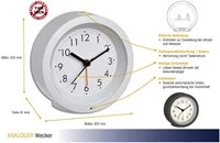 Met de ronde TFA wekker heb je altijd de actuele tijd in beeld, ook 's nachts. Want zodra de lichtsensor duisternis registreert, gaat er automatisch een zwak licht aan. Ook de analoge wijzerplaat kan met een druk op de knop fel verlicht worden.