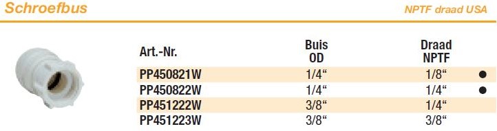 John Guest PP-inch schroefbus NPTF draad USA