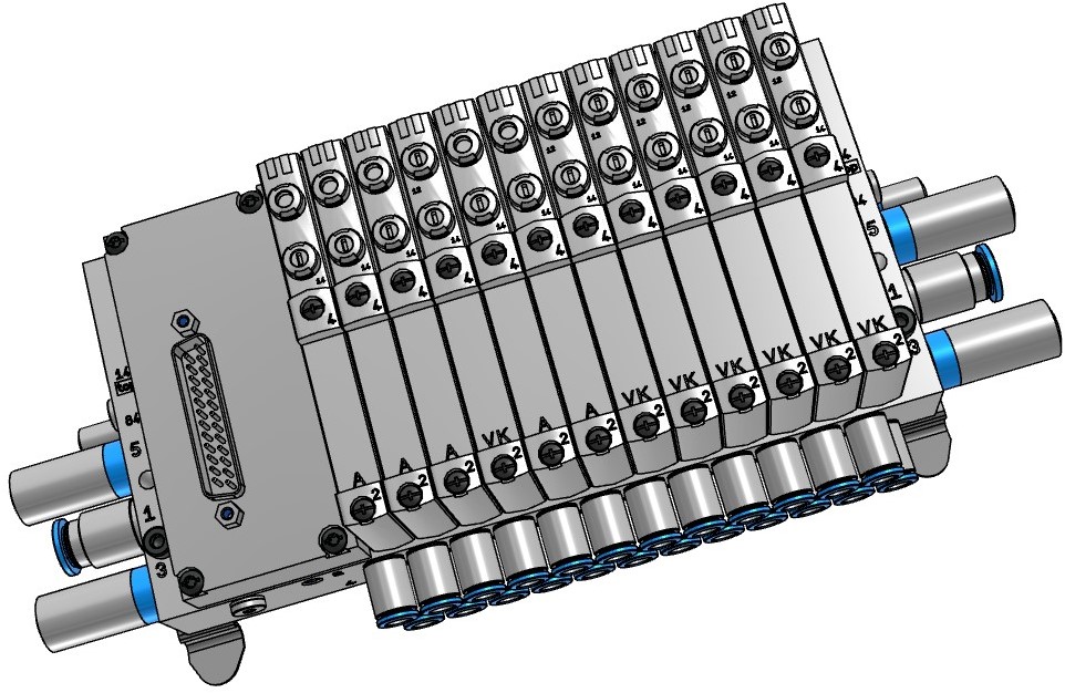 Multipin aansturingVentielen: 3x 5/2 ventiel NC 1x dubbel 3/2 NC 2x 5/2 ventiel NC 6x dubbel 3/2 NC Voeding: 8 mm koppelingUitgang: 6mm koppelingenDIN-rail montage