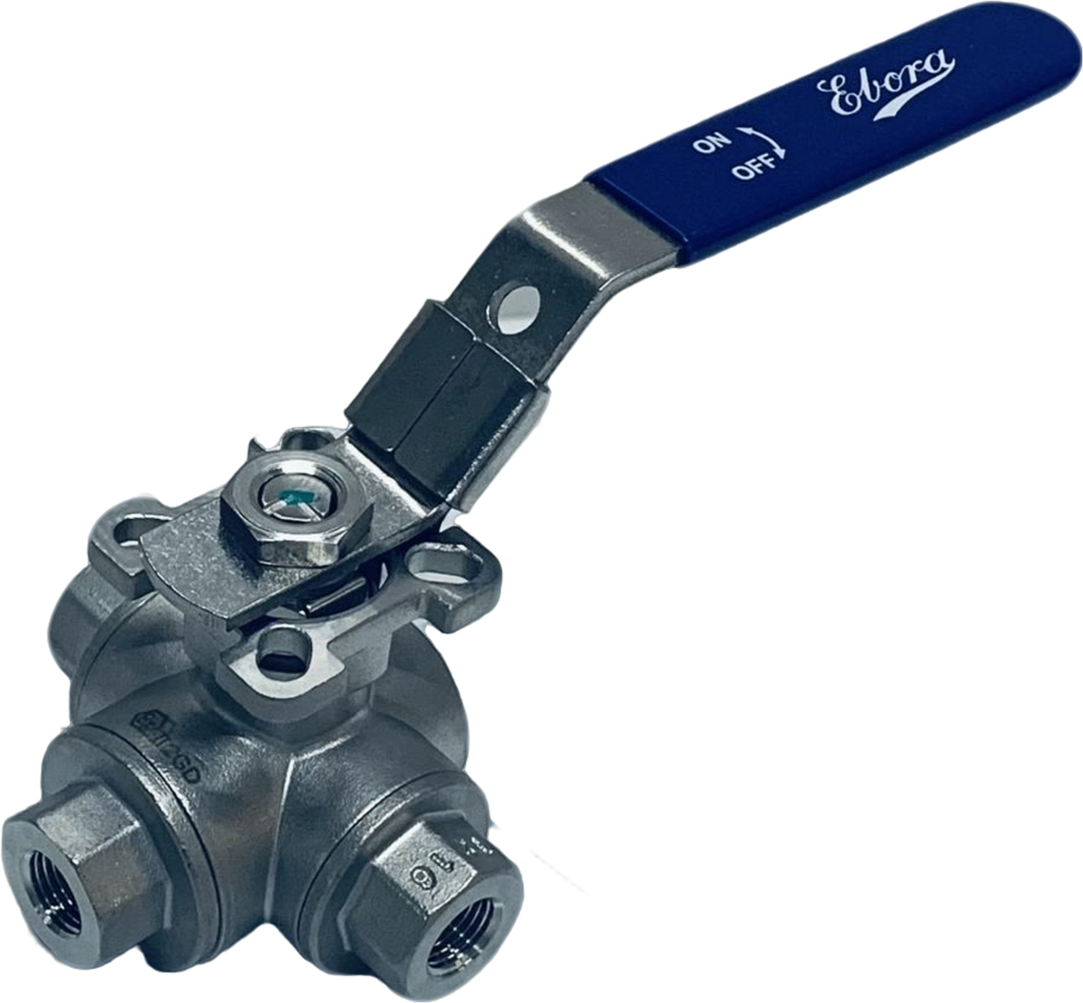 3-weg RVS kogelkraan 1/4 BSPP met L-boring, PN63 met opbouwflens ISO5211 F03/F04, vierkant 9 mm, met hendel, QL18-31121