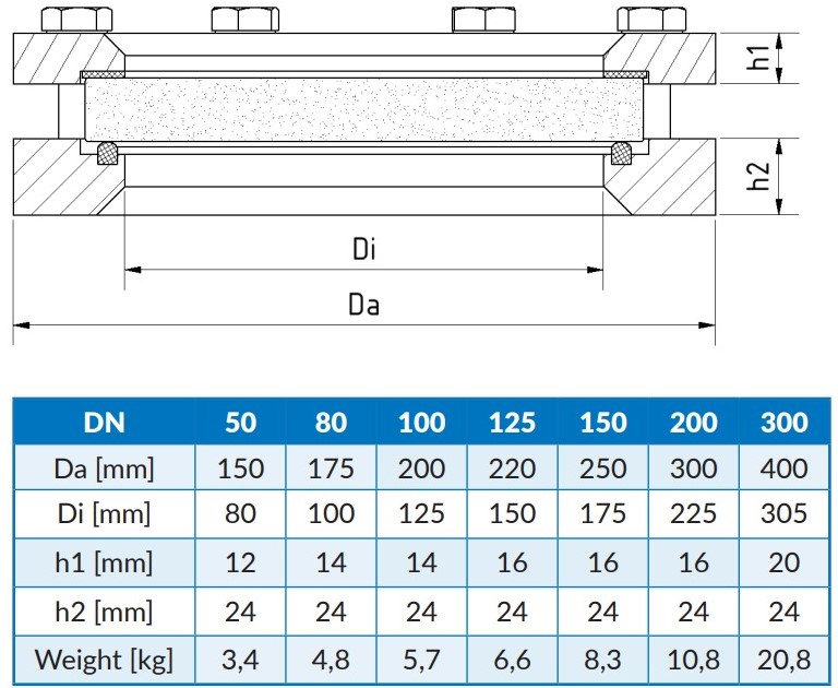 Vergeleken met DIN 28120 kenmerkt het Type 318V zich door een slanker en lichter ontwerp, wat het tot een kosteneffectief alternatief maakt voor toepassingen met lage bedrijfsdrukken. We gebruiken hoogwaardig roestvaststaal 1.4571 (316Ti) voor de flenzen en chemisch bestendig borosilicaatglas DIN 7080 voor het kijkglas.