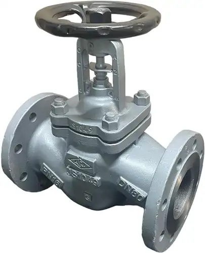ARI-Armaturen geflensde-Balgafsluiter FABA-Plus 22.046 DN50, PN16, EN-JS1049, vaste vlakke klepOnderhoudsvrije metaalafdichtende doorlaatklep met flenzen, behuizing van nodulair gietijzer EN-JS1049 met grondverf, spindelafdichting door dubbelwandige roestvaststalen balg van 1.4571, interne onderdelen van 1.4021+QT, fijn-draad spindel met uitwendige en gerolde draad, platte smeernippel, verzonken vergrendelingsinrichting, warmteafvoerende beugeldeksel geoptimaliseerd voor accessoires van EN-JS 1049, veiligheidsstopbus, demonteerbare draaibeveiliging met indicatie-inrichting, lekdichtheid klasse A volgens EN12266, niet-stijgend metalen handwiel met kathodische elektroforesecoating, naderhand monteerbare eindschakelaar, volledig isoleerbaar volgens het Gebäudeenergiegesetz - GEG, TRB 801 Nr.45, TA-Luft en EN ISO 15848-1 op aanvraag, DIN-DVGW-registratie GAS, bouwlengte volgens EN558/1, mediumtemperatuur: -10 - +350°C, nominale druk: PN 16, nominale diameter: DN50, zittinguitvoering: randzitting (smoorfunctie), gewicht: 11 kg, artikelcode: 220460050011.