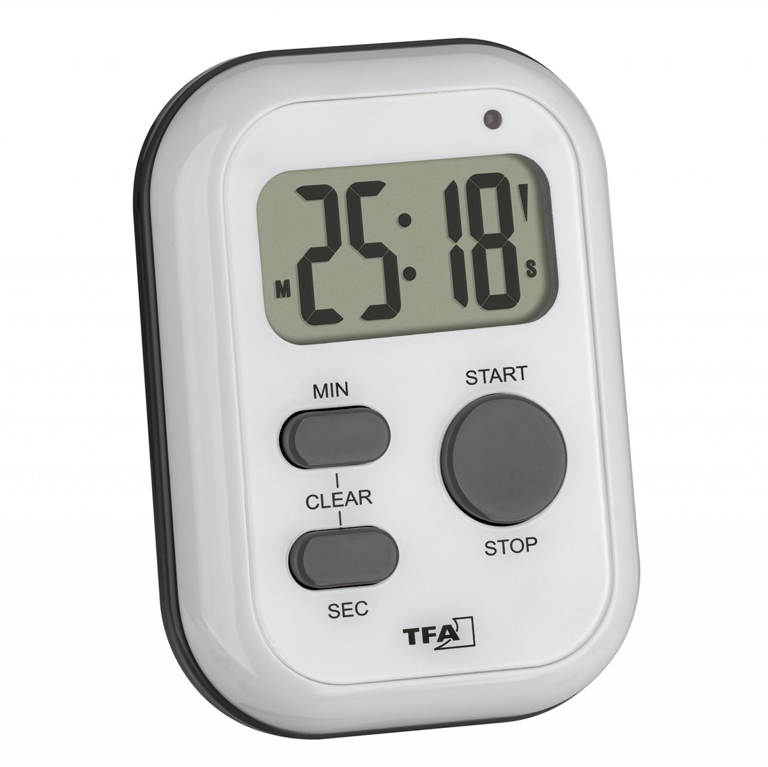Kook het perfecte 5-minuten-ei, verbeter het timemanagement op het werk of versla uw persoonlijke beste tijd bij het sporten: dit zijn slechts enkele van de mogelijke functies van deze digitale timer van TFA met geïntegreerde stopwatch. Het handzame formaat maakt het uw ideale dagelijkse metgezel. Wanneer de ingestelde tijd is bereikt, wordt u gewaarschuwd door een knipperend licht, trilling en/of alarmtoon - ideaal voor op kantoor, examens of studiesessies in de bibliotheek. Met dit apparaat kunt u de tijd meten tot 99 min en 59 s. De verstreken tijd wordt weergegeven op het display. U kunt de timer op uw bureau plaatsen met zijn uitklapbare standaard of hem met een clip aan uw kleding bevestigen, zodat u dit handige apparaat altijd bij de hand hebt. U kunt ook een lint door de lus van het snoer halen en de timer gewoon om uw nek hangen. Twee standaard AAA-batterijen (niet meegeleverd) voeden de timer, waardoor hij flexibel in gebruik is. U kunt hem zelfs meenemen op de camping.
