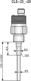 Gedeeltelijk beklede staafelektrode, voor de detectie van het niveau van elektrisch geleidende en niet-geleidende vloeistoffen, gedeeltelijk bestand tegen dampcondensatie in het detectiegebied. Elektrode-isolatie van FEP-materiaal. Installatie van bovenaf