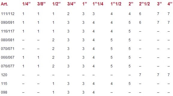 De verlengde handgreep in aluminium kan worden gebruikt met de ventielen die in de tabel zijn aangegeven.