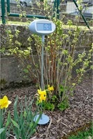 Het ongewone, beschermde ontwerp doet denken aan de retrostijl uit de jaren 70. De deelbare staaf is gemaakt van aluminium en wordt eenvoudig in de grond gestoken om hem op te zetten. Het plaatsen van de thermometer midden in de tuin op 1 meter hoogte heeft als voordeel dat de temperatuurwaarden niet vervalst worden door een huismuur en de daadwerkelijke buitentemperatuur wordt gemeten.