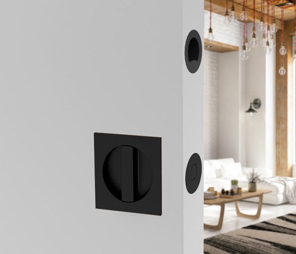 Een schuifdeur kan met dit schuifdeurslot volledig in de wand geschoven worden. Met behulp van de bijgevoegde vingerkom kan de deur via de kopse kant weer uit de wand getrokken worden.
