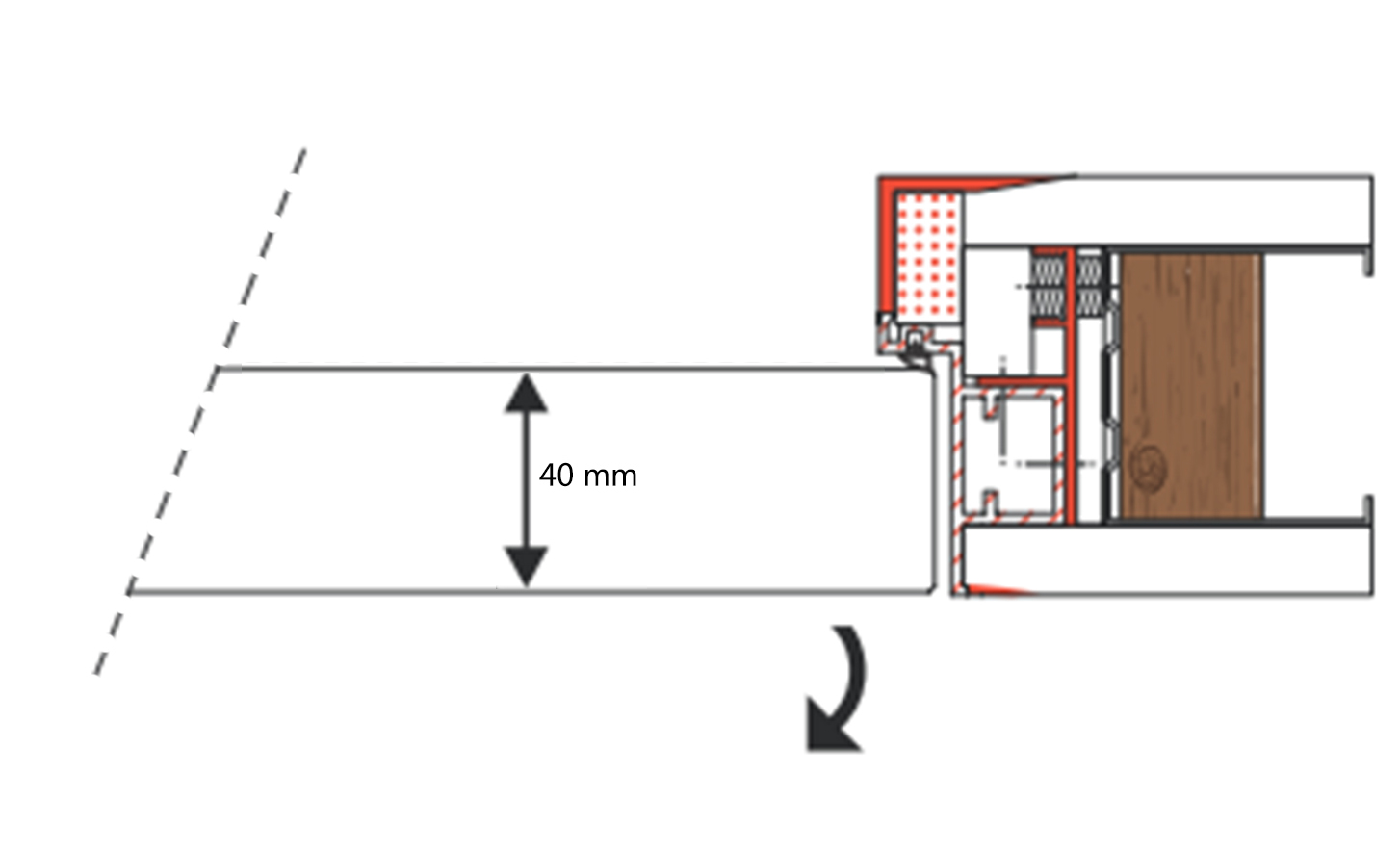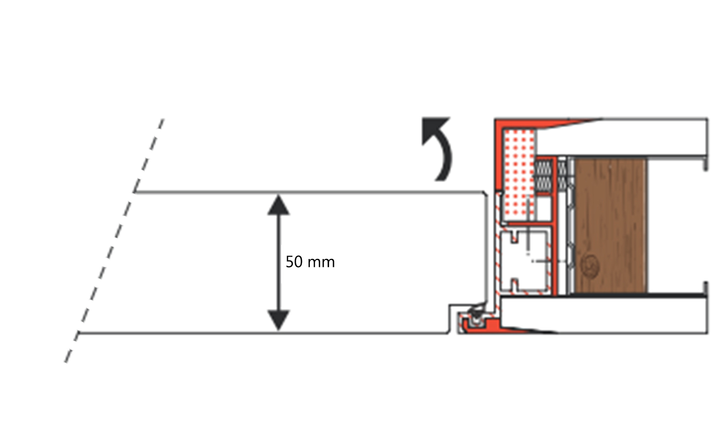 Let er wel op dat je voor een duwkozijn een 50 mm dikke deur besteld. Bij onze 50 mm deuren wordt standaard de sponning aan de voorzijde van de deur gefreesd die nodig is voor een Xinnix duwdeur (dit kun je zien in de doorsnede afbeelding).