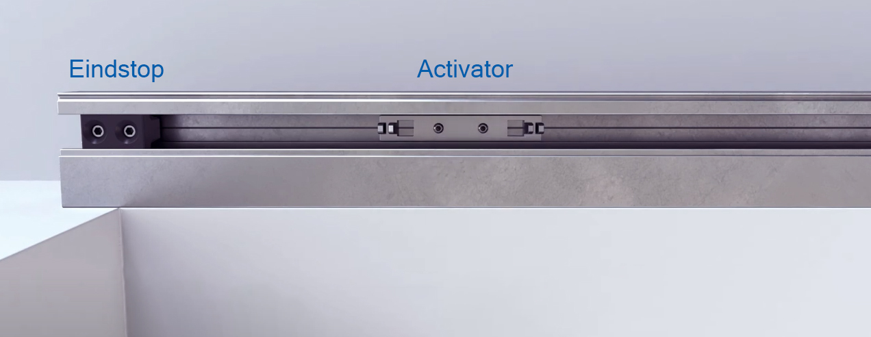 Als de softclose loopwagen gespannen is kun je alle onderdelen in de rails plaatsen. Zorg ervoor dat je eerst de loopwagens in de rail doet. Daarna schuif je aan beide zijden de activators in de sleuf bovenin de rail en als laatste plaats je de eindstops aan de uiteindes van de rail. Bekijk hiervoor ook deze montagefilm van Krona Koblenz.