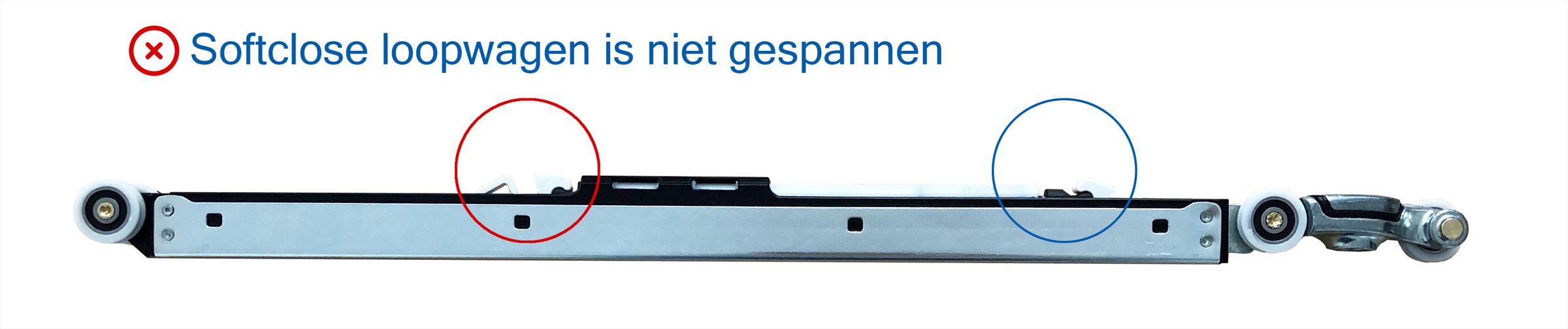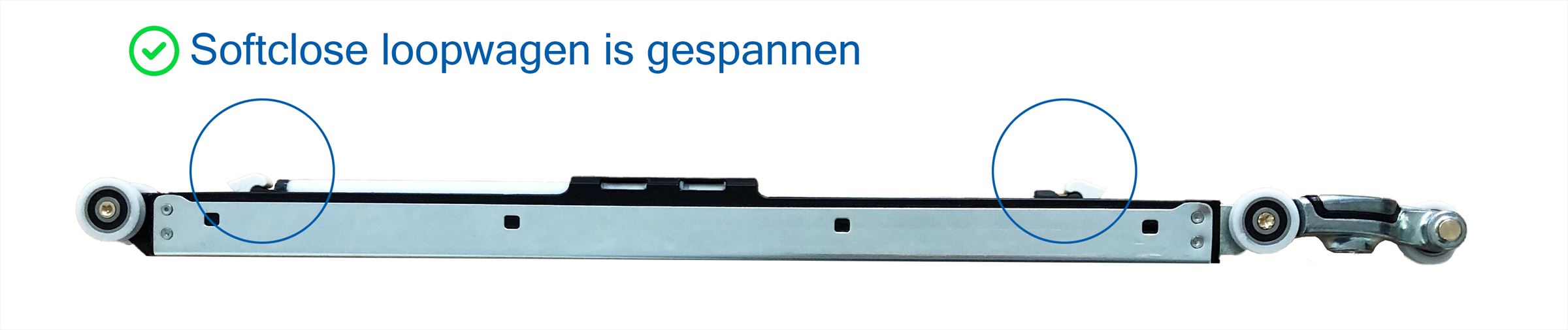 Voordat je de softclose loopwagen in de rail plaatst moet je zorgen dat deze geactiveerd is. Dit doe je door beide vinnetjes aan de bovenkant te spannen. De loopwagen is gespannen als beide vinnetjes zich aan de buitenkant van de loopwagen bevinden.