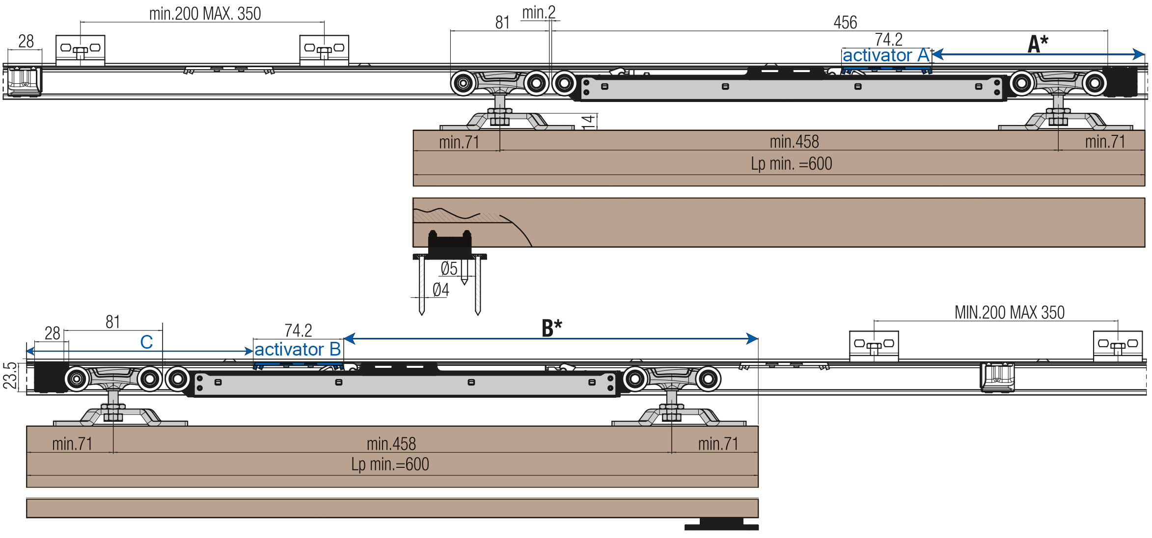 Afstand A: de afstand tussen het einde van de rail en het einde van activator A (zie de blauwe pijl in onderstaande afbeelding). Deze afstand hangt samen met de plek waar je de schuifdeur ophangplaatjes op de deur monteert. Als je 71 mm hanteert tussen het hart van de ophanging en het einde van de schuifdeur (zoals deze staat aangegeven op onderstaande tekening), dan is afstand A: 176 mm.