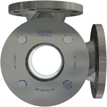 Das ACI Hochdruck Eckschauglas Typ 575 ist ein hochwertiges Durchfluss-Schauglas mit Anschlussflanschen, perfekt geeignet zur Installation an Rohrbögen.