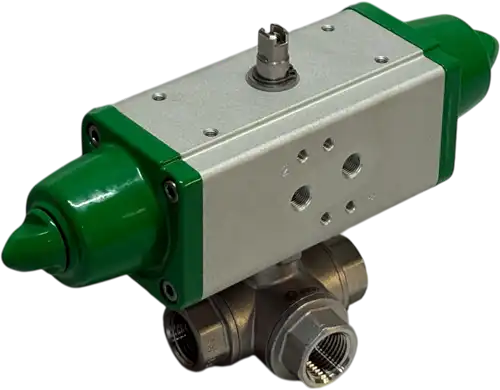 3-weg Edelstahl-Kugelhahn L 1/2 BSPP, PN64, PTFE-FKM, mit Aluminium einfachwirkende Pneumatikantrieb Typ GS15
