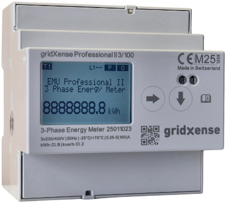 The gridXense Professional II 3/100 LoRa is an electronic 3x 230/400VAC 3-phase kWh meter for DIN-rail mounting and direct measurement up to 100A. The meter has various functions including measuring actual and reactive consumption, calculating the power factor (cos phi), and providing clear insights into consumed and generated energy (import/export). The meter is equipped with an integrated LoRaWAN wireless interface with an integrated antenna and can be configured via a downlink.