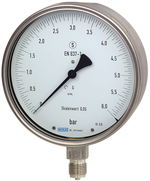 • Safety pressure gauge with solid baffle wall designed in compliance with operational safety requirements of EN 837-1