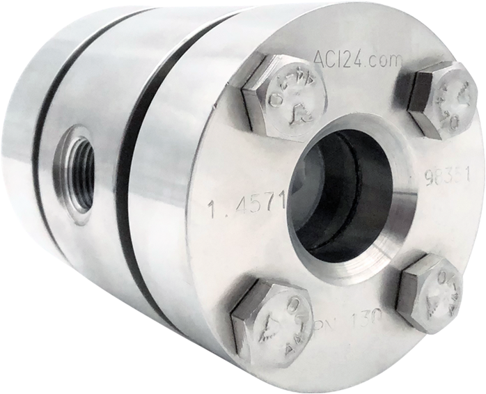 The ACI high-pressure sight glass, known as Type 522, is specifically designed for observing and illuminating processes under operating pressures of up to 320 bar. The base version features a solid stainless steel or steel housing with two female threaded connections to Whitworth, NPT, or a standard of your specification, directly machined into the solid housing wall. This design eliminates the need for welding seams and other extensive processing, allowing us to maintain short delivery times.