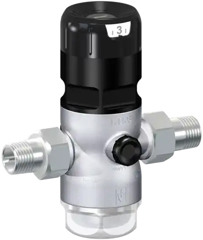The pressure reducing valve features an easy-to-clean filter screen with a transparent filter cup, safeguarding the downstream system, the high-performance plastic valve insert, and the setting scale visible from two angles. A V4A filter cup is also available as an alternative for hot water and PN25 applications.