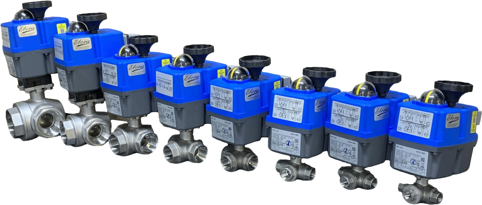 Ebora 3-way stainless steel ball valve T bore, 3/8 BSPP, PN63, with actuator J4CS20 stainless steel/PTFE-FKM, 24-230V , running time 10sec. EBQT18-31122-J4CS20
