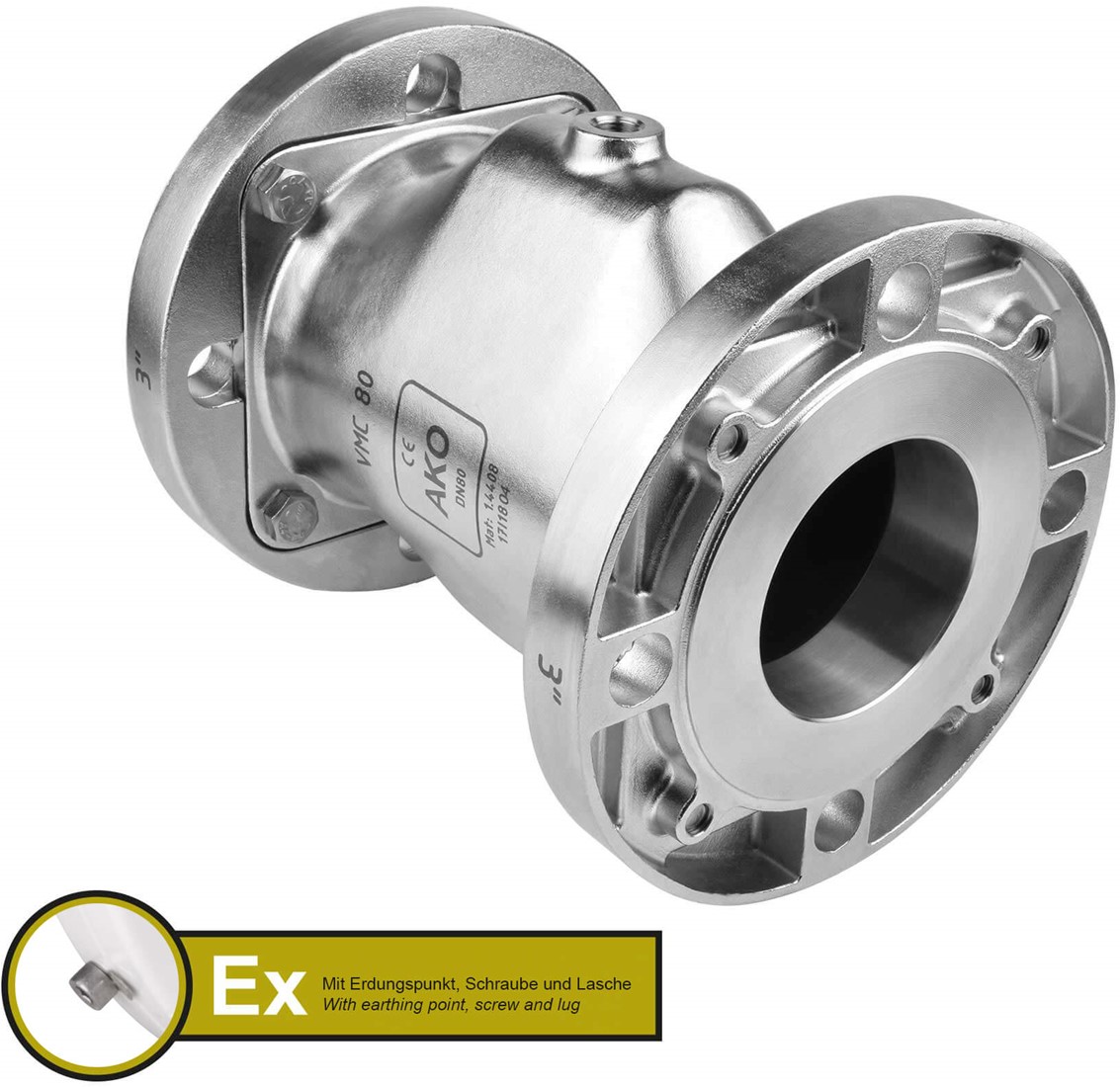 AKO Armaturen Air operated pinch valve VMC, Flange (ANSI) Stainless steel 1.4408/EPDM HTEC (food, cond.) DN 80, VMCX80.04HTECLF.50FA.50