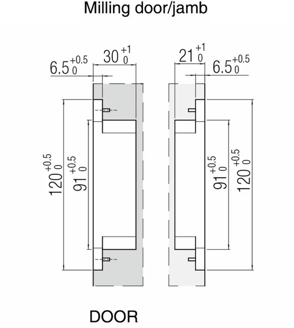 Enkelvoudige freesmal van betonplex voor het infrezen van het Kubica K8000 scharnier in zowel deur als kozijn.