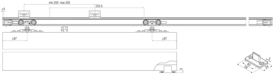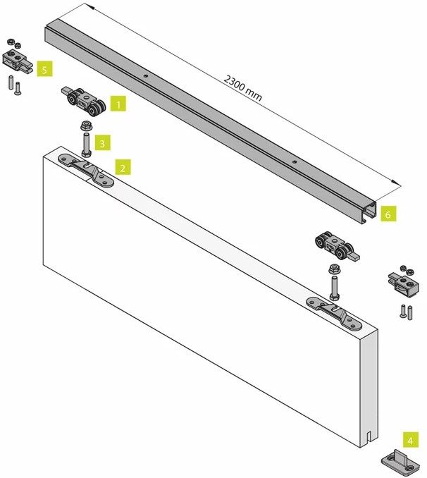 Bij deze schuifdeurset zit een rail met lengte 230 cm. Deze raillengte is precies op maat voor een deur van 118 cm. Is je deur smaller dan 118 cm? Dan kan je de rail op maat zagen. De ideale raillengte is twee keer de deurbreedte min 6 cm. Zo blijft de rail altijd boven de ondergeleider.