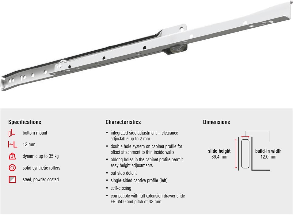 Dankzij de geïntegreerde hoeklijn is deze ladegeleider geschikt voor bodemmontage: de lade kan eenvoudig op de geleider worden geplaatst. De 3132 ladegeleider is een kwaliteitsproduct van het merk Fulterer.