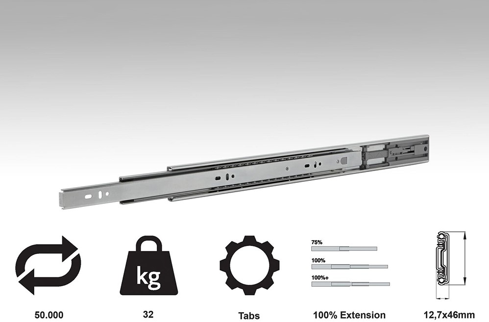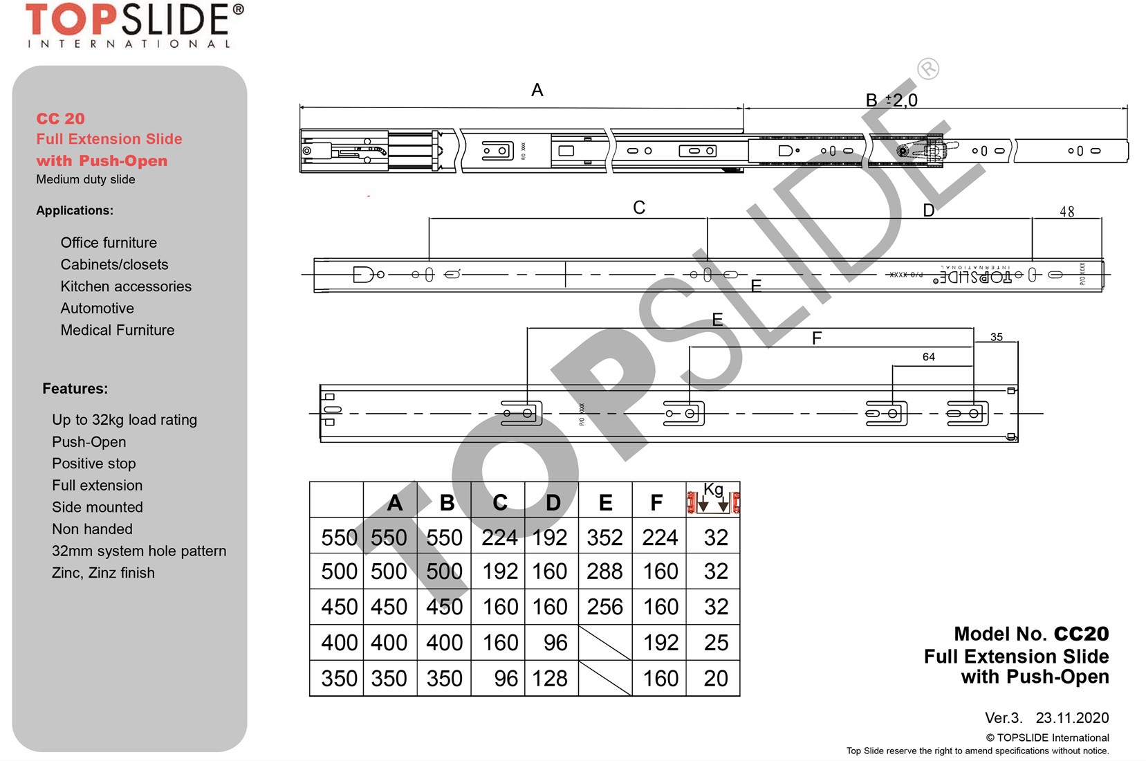 De CC20 ladegeleider is een volledig uittrekbare kogelgeleider, voorzien van een ingebouwd push to open mechanisme. Dankzij deze functie opent de lade soepel en automatisch wanneer je deze licht indrukt. Ideaal voor greeploze meubels waar een strak design en gebruiksgemak samenkomen.