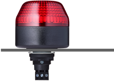 The beacon is designed for panels with a Ø 22.5 mm (M22) mounting hole. An adapter is available for Ø 30.5 mm panel size. The robust housing is made of UV-stabilised polycarbonate and available in black (RAL 9005) or grey/white (RAL 7035). The internally ribbed lens is available in various colours: transparent, red, orange, blue, green or yellow.