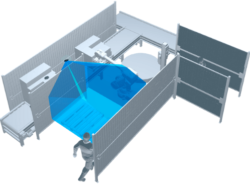 Safeguarding focuses on immediately stopping hazardous machine movements as soon as someone enters a monitored area. The sensor acts as a virtual safety light curtain and is ideal for securing open installations or robot cells, for example.